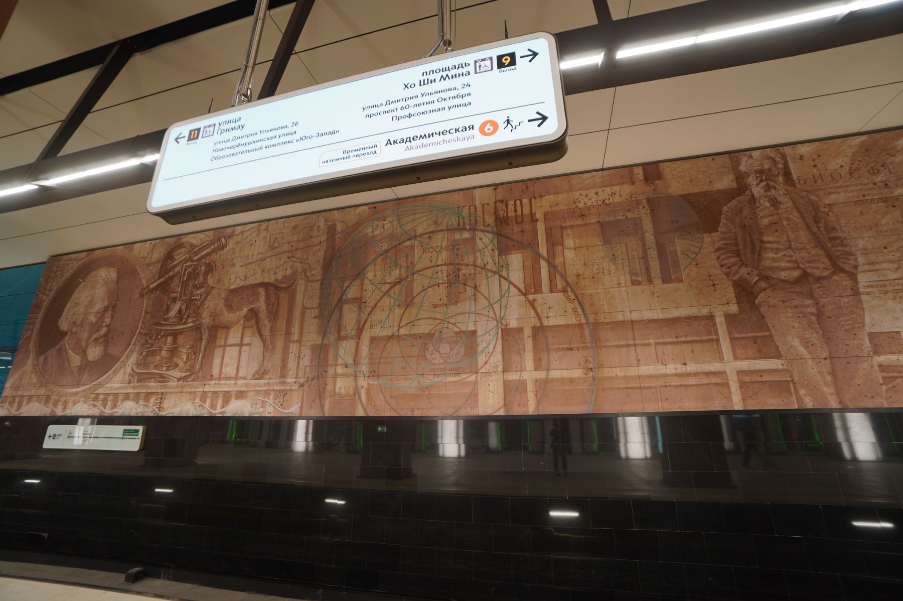 Центральным элементом концепции стали художественные панно на путевых стенах. На них изображены портреты выдающихся отечественных учёных и здание РАН.