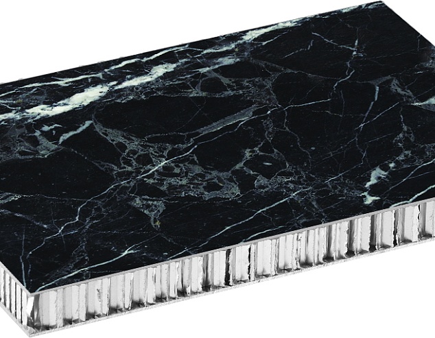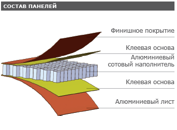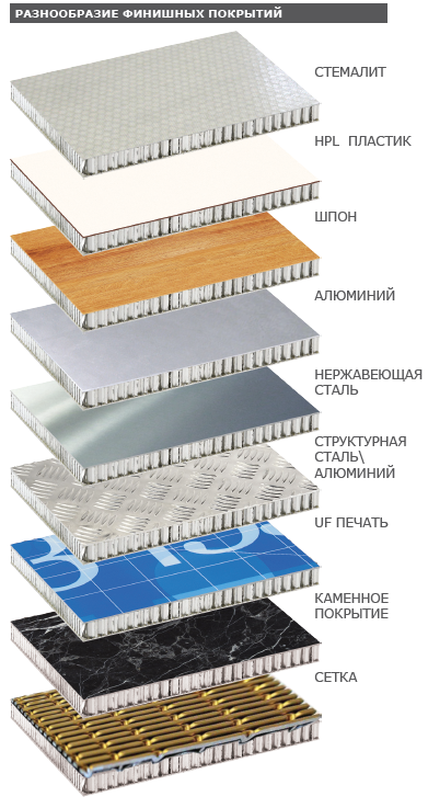 Многослойная сотовая панель — конструкция из двух алюминиевых листов, пространство между которыми заполняет ячеистая структура из алюминия (либо гофрированный алюминий). Трехслойная сотовая панель может иметь разнообразные финишные поверхности: алюминий, камень (натуральный и искусственный), стекловолокнистая ткань, медь, сталь (в том числе нержавеющая), НPL-пластик, медь, ламинат, пленка ПВХ, шпон, порошковая покраска, UF-печать, сублимация. Сэндвич-панель на основе сотового/гофро алюминия – это не только декоративный элемент. Панель выполняет функцию вибро- и звукоизоляции. Кроме того панели с сотовым заполнением очень просты в монтаже. Обладают малым весом, благодаря чему установка проходит быстро и легко. Также алюминиевые сотовые панели устойчивы к внешним воздействиям. Не подвергаются коррозии, внутренняя прослойка позволяет добиться высокой жесткости и прочности. Поверхность панели невосприимчива к воздействию солнечных лучей и агрессивных химических сред и отвечает всем требованиям пожарной безопасности. Мы имеем собственное производство сотовых панелей в Московской области.
