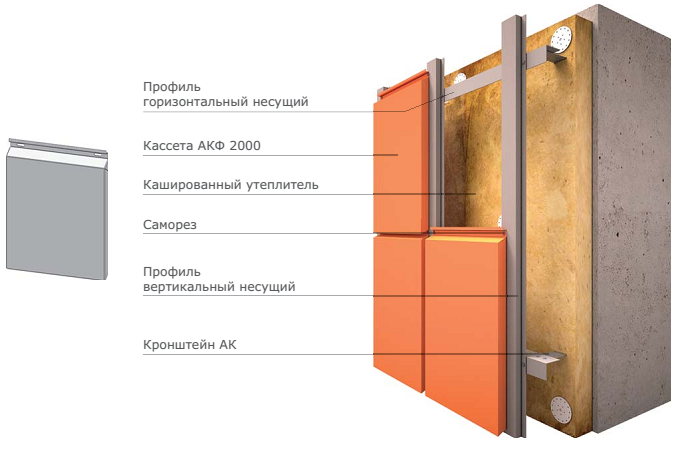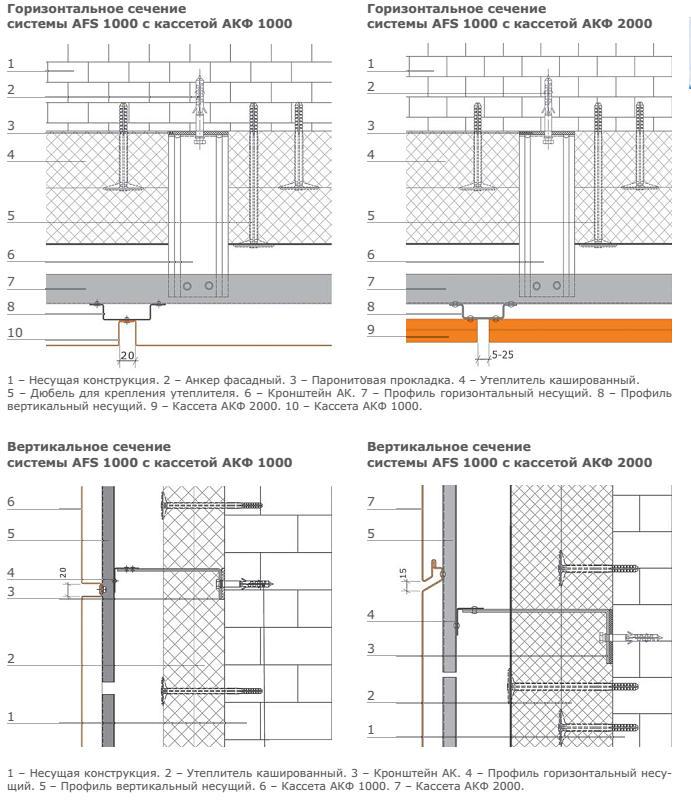 Наружный экран вентилируемого фасада, выполненный из окрашенной оцинкованной стали или алюминия, защищает расположенный за ним слой теплоизоляции и ограждающую конструкцию здания от атмосферных воздействий. В летние месяцы дополнительно выполняет функцию солнцезащитного экрана, отражающего значительную часть падающего на него теплового потока. Для фасадной системы AFS 1000 разработаны и выпускаются два вида кассет: АКФ1000 и АКФ2000.