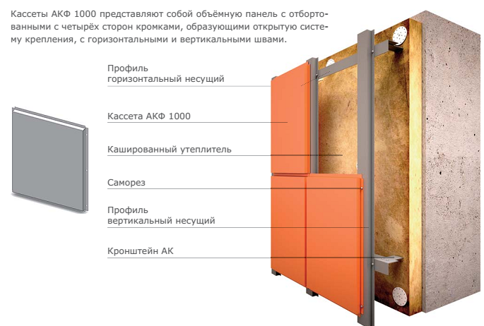 Кассеты АКФ1000 представляют собой объёмную панель с отбортованными с четырёх сторон кромками, образующими открытую систему крепления, с горизонтальными и вертикальными швами.