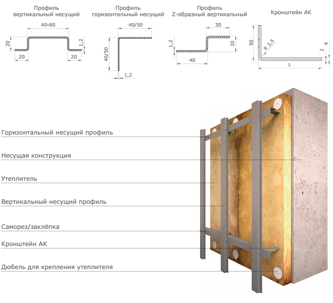 Несущий каркас состоит из прокатных и штампованных профилей. Он нивелирует неровности несущих стен здания иформирует необходимый воздушный зазор между утеплителем и облицовкой. В качестве элементов подконструкции используются: