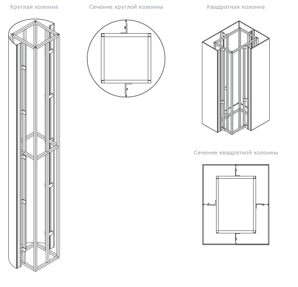 Конструктивно облицовка колонн состоит из нескольких составных элементов, имеющих определенную форму. Каждый элемент облицовки имеет декоративную поверхность и замочную часть. Количество элементов, необходимых для облицовки одной колонны, зависит от размеров колонны.