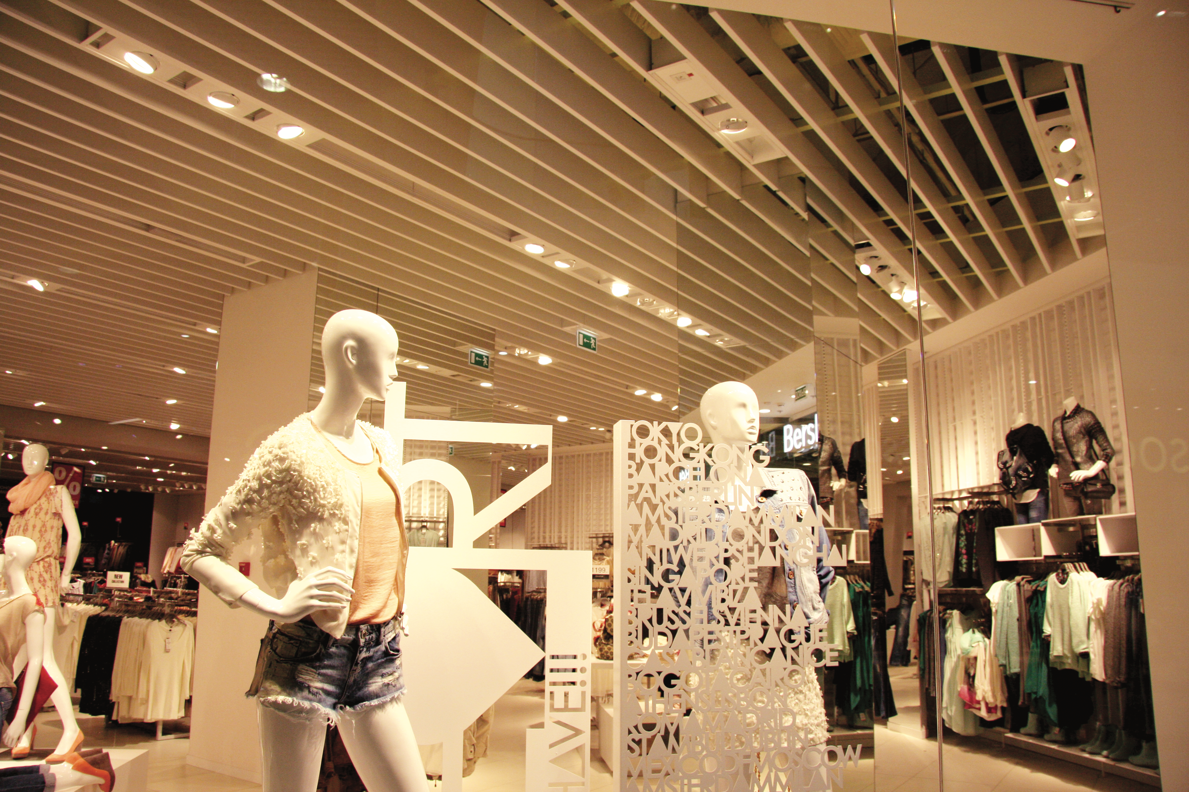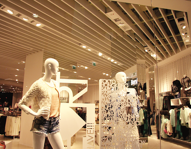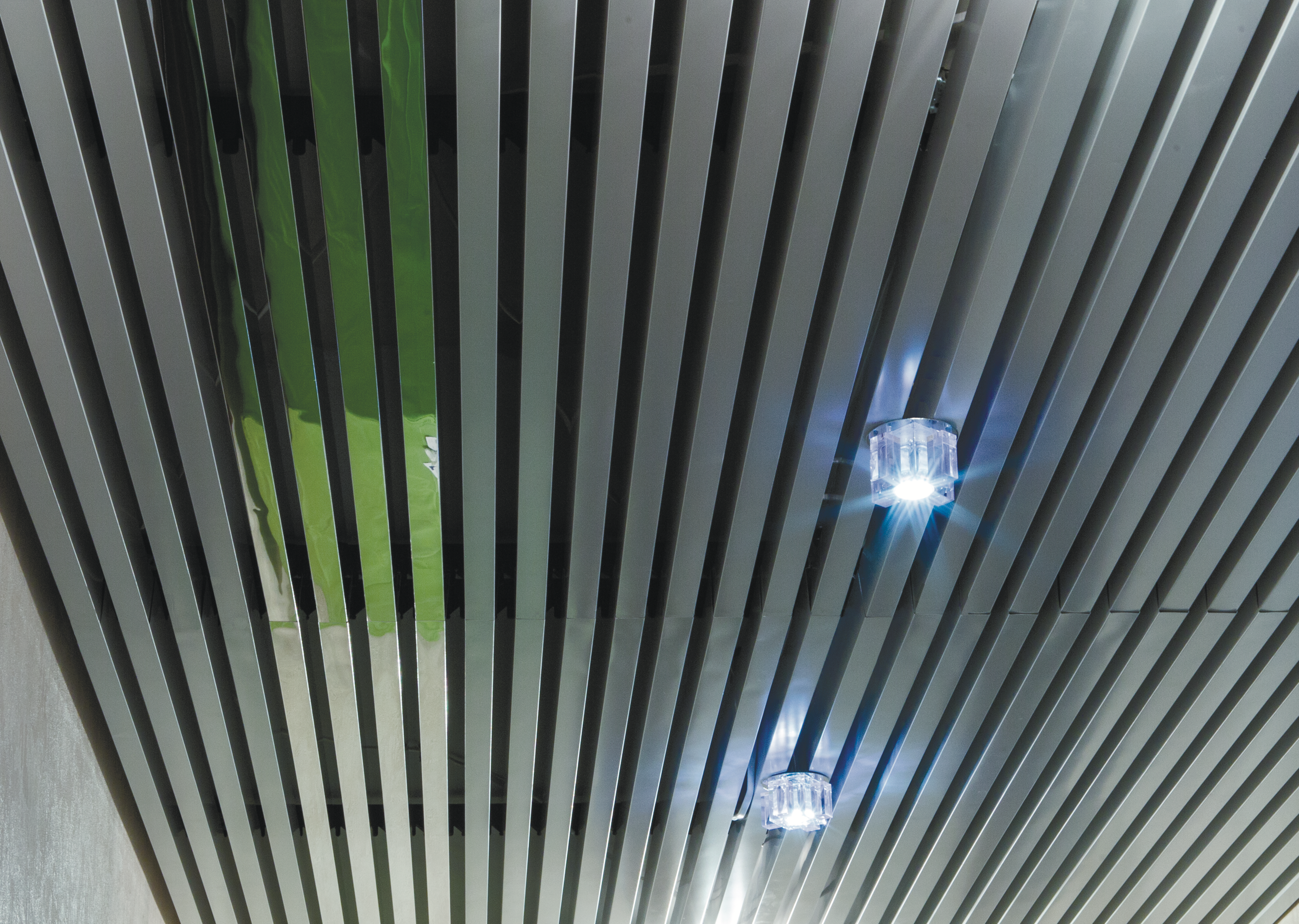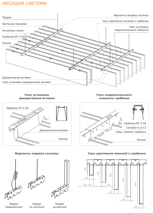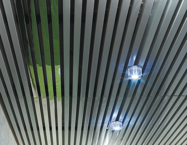 При монтаже потолка допускается установка рядом друг с другом панелей различной высоты; расстояние между панелями может варьироваться с шагом50 мм. В состав системы могут быть включены устанавливаемые между панелями светильники, способные выгодно подчеркнуть созданную архитекторами структуру потолка.
