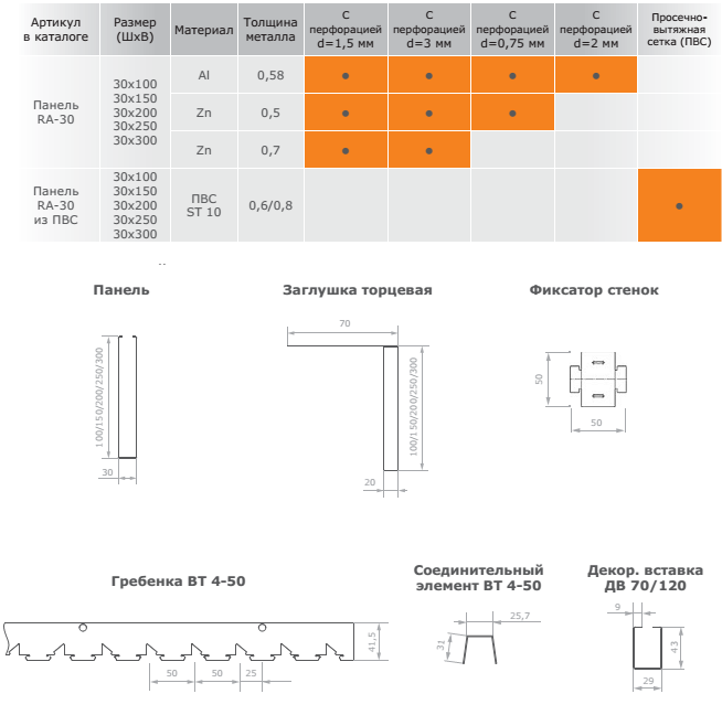 Потолочная система собирается из наборных вертикальных перфорированных панелей, высота которых варьируется от 100 до 300 мм с шагом 50 мм при стандартной длине 1200/1800/2000 мм. Панели изготавливаются из алюминия, оцинкованной стали или просечно-вытяжной сетки с окраской в любой из цветов по каталогу RAL.