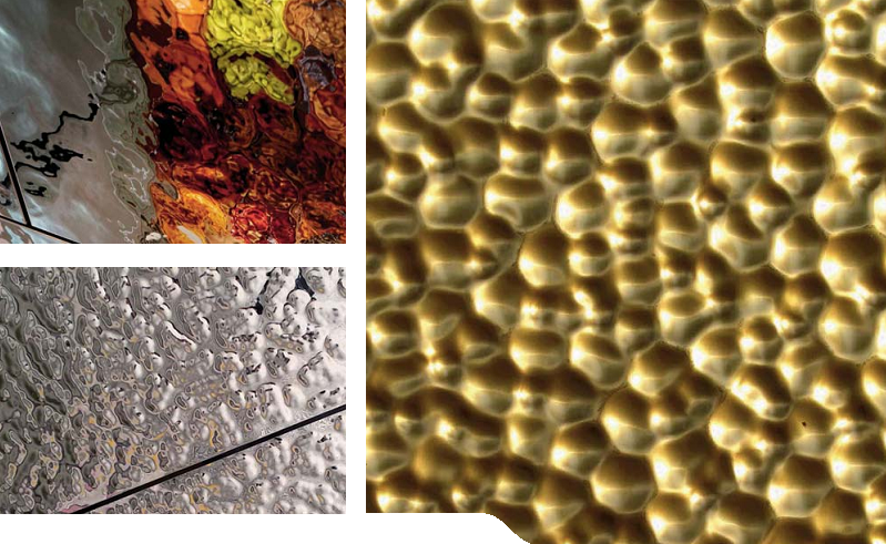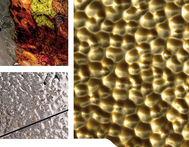 Анодирование позволяет получать материал с очень высоким коэффициентом отражения – такие поверхности широко применяются при создании декоративных источников освещения, используются в качестве рассеивающих и отражающих поверхностей при отделке помещений культурно-развлекательного назначения, причём не только в составе светотехнических решений, но и как декоративные элементы. Мы предлагаем изготовление анодированных алюминиевых изделий как на заказ, по сконструированному шаблону, так и с использованием одного или нескольких из уже готовых рисунков рельефа. Материал прекрасно сохраняет свои светоотражающие характеристики. Возможно изготовление точечно деформированных и перфорированных элементов. Помимо алюминия в качестве исходного материала может применяться и нержавеющая сталь.