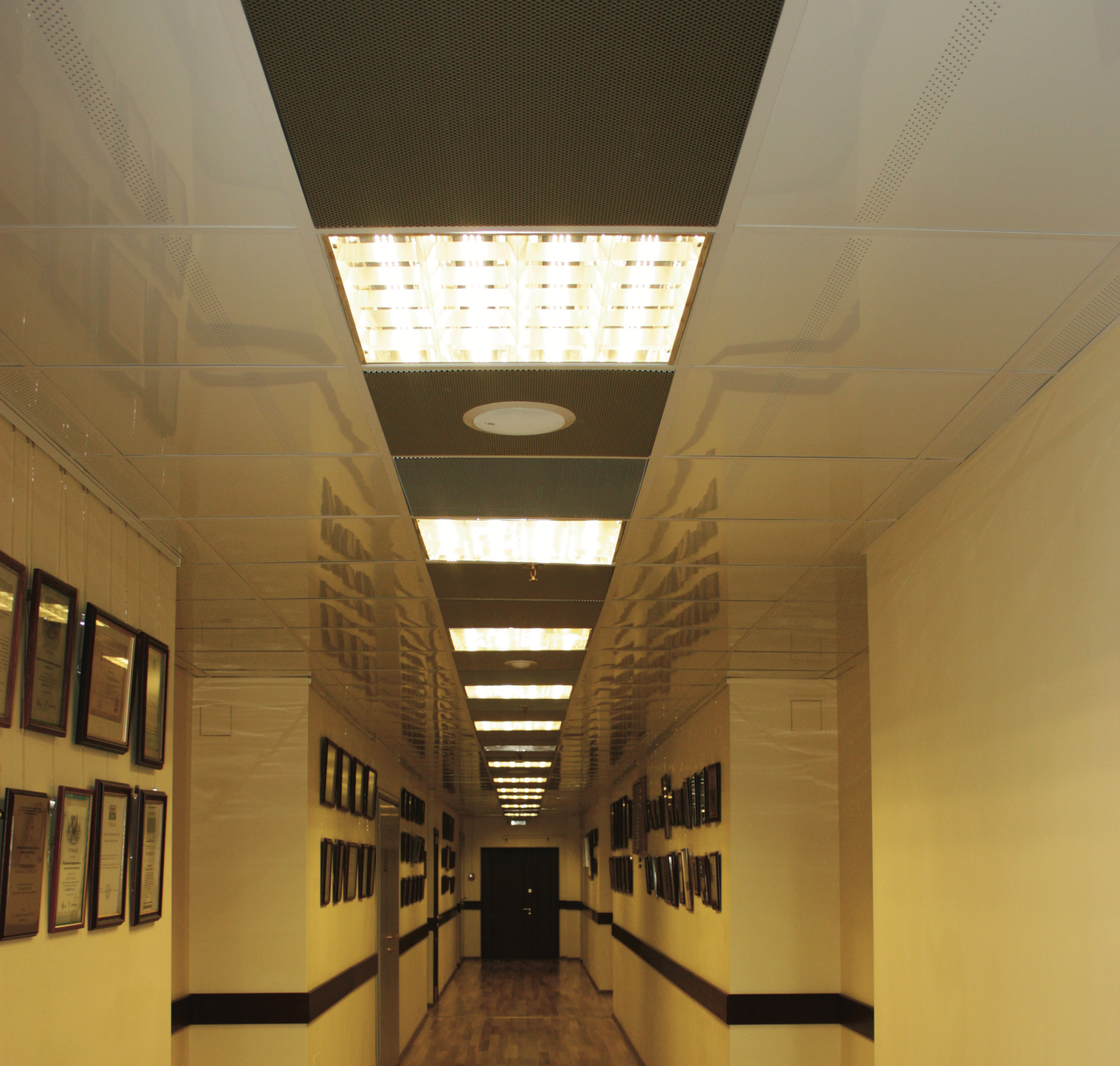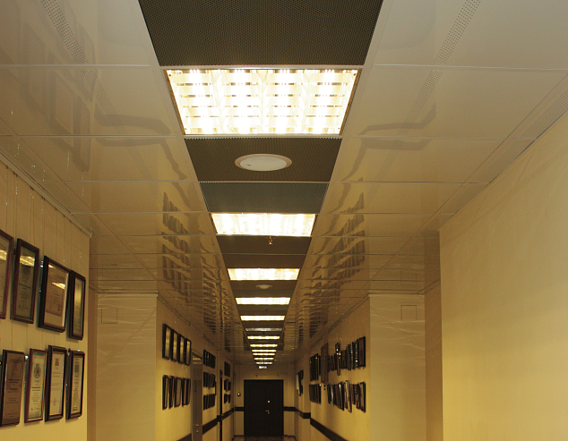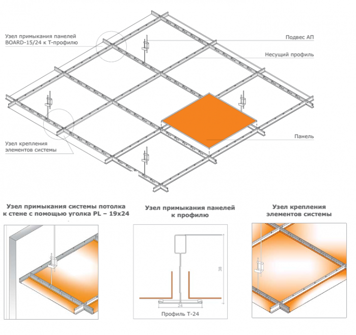 Устанавливаемые на открытую подсистему панели имеют модульные размеры, кратные 300, угол кромки составляет 90°. Изготавливаются из алюминия или оцинкованной стали. Возможны различные варианты декоративного оформления: перфорация (в том числе с применением акустической подложки), художественная резка и плоттерная печать. Панели выпускаются с различными вариантами покрытия