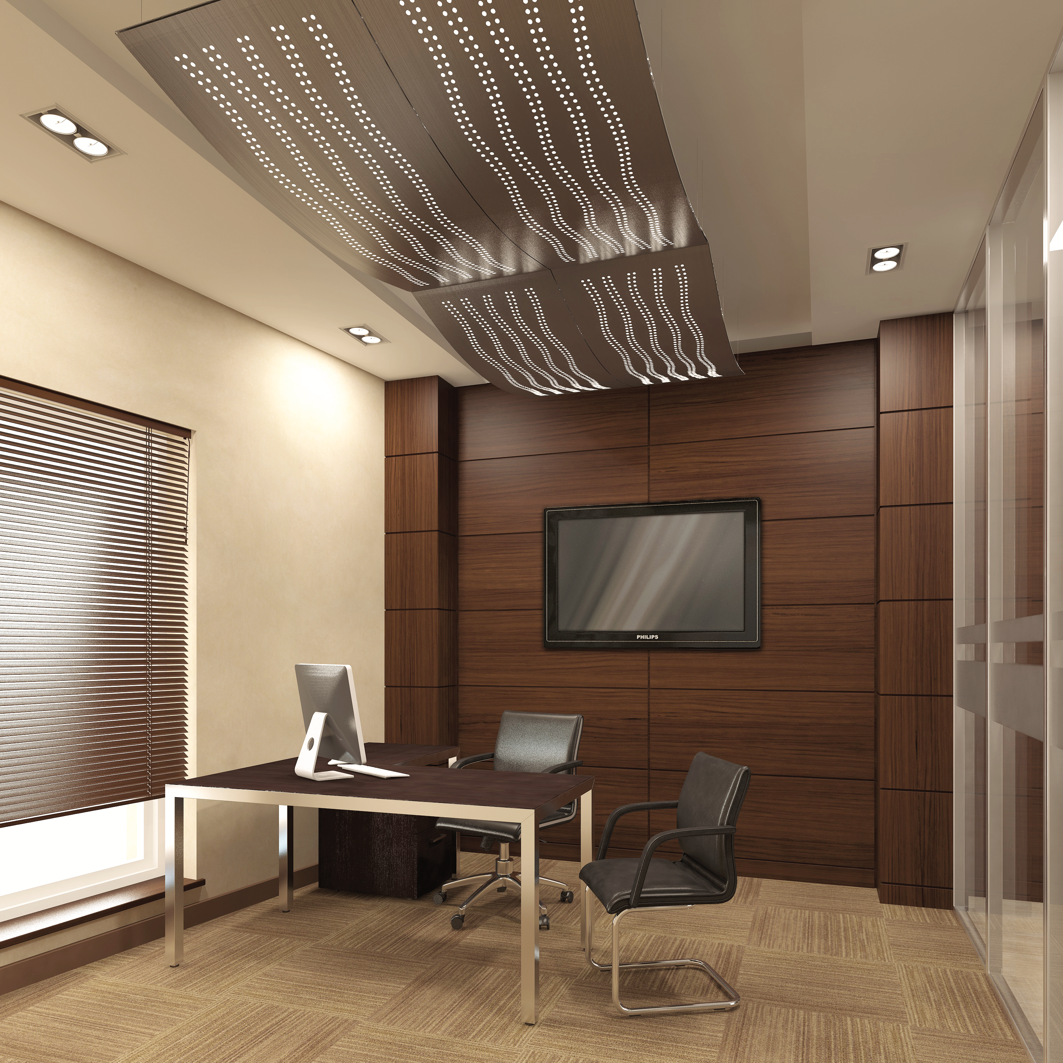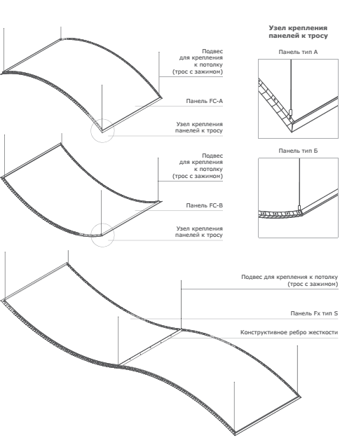 Панели FC крепятся к черновому потолку при помощи металлического троса с зажимом и могут раз-мещаться на некотором расстоянии друг от друга, тем самым подчёркивая изысканность и плавность линий каждой отдельной панели.