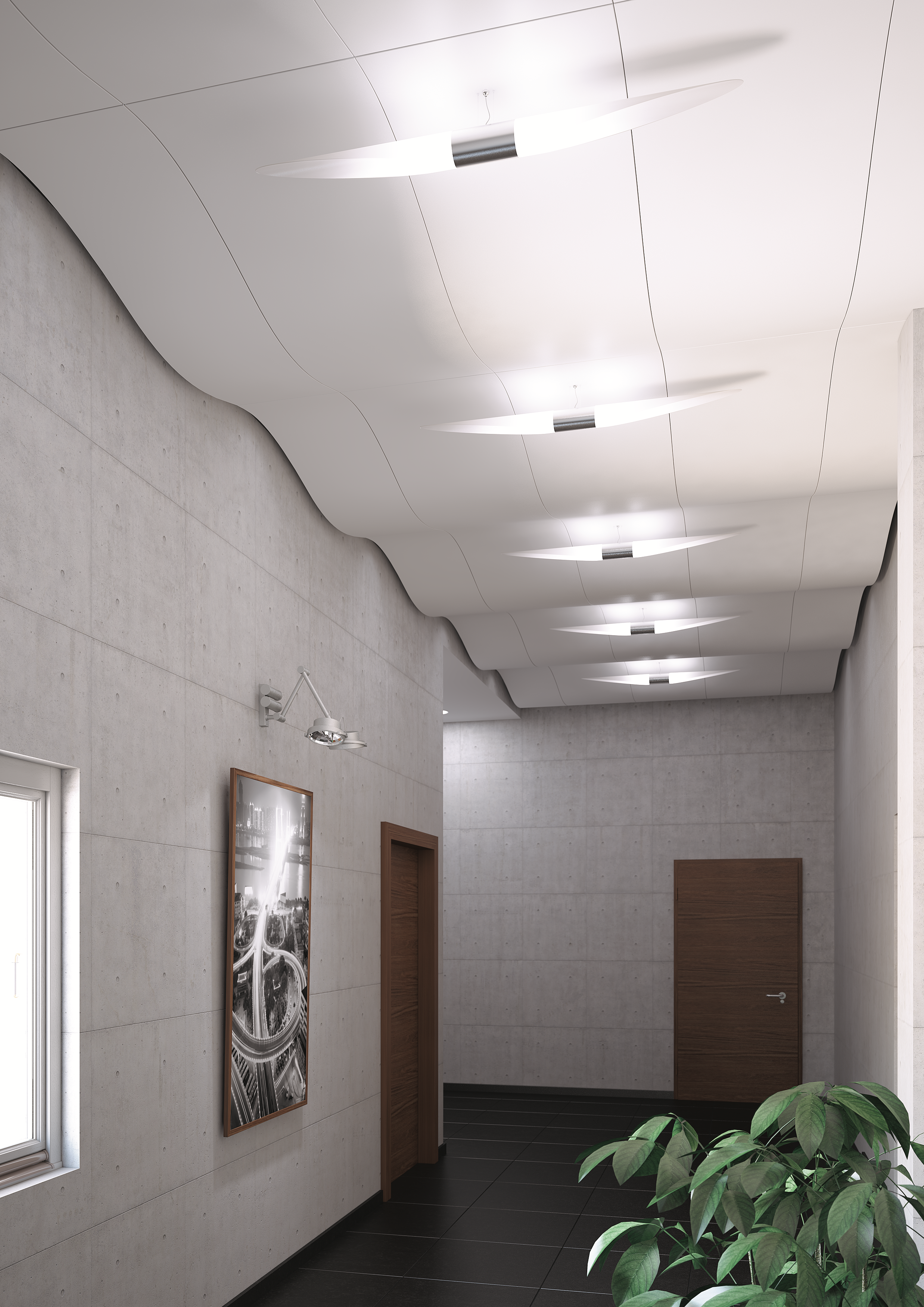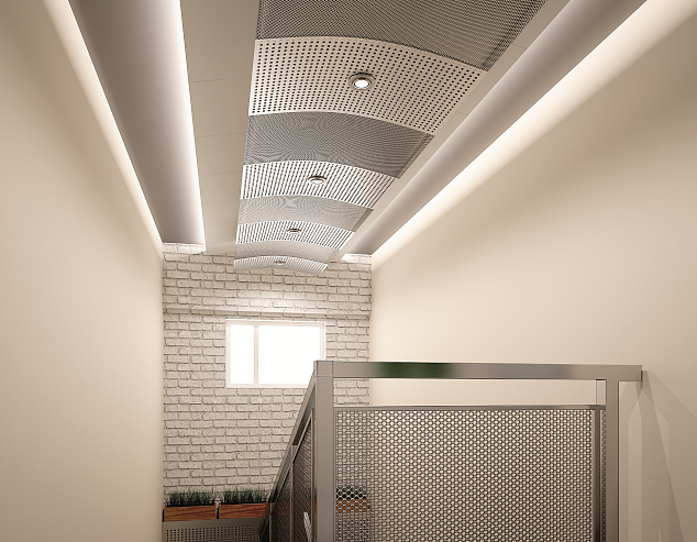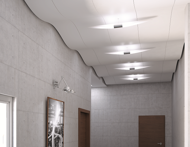 При установке вплотную друг к другу с применением системы HOOK-ON, панели FC служат хорошей альтернативой традиционной плоской потолочной поверхности. Цельность и монолитность конструкции достигается за счёт плавного перехода от одной панели к другой.