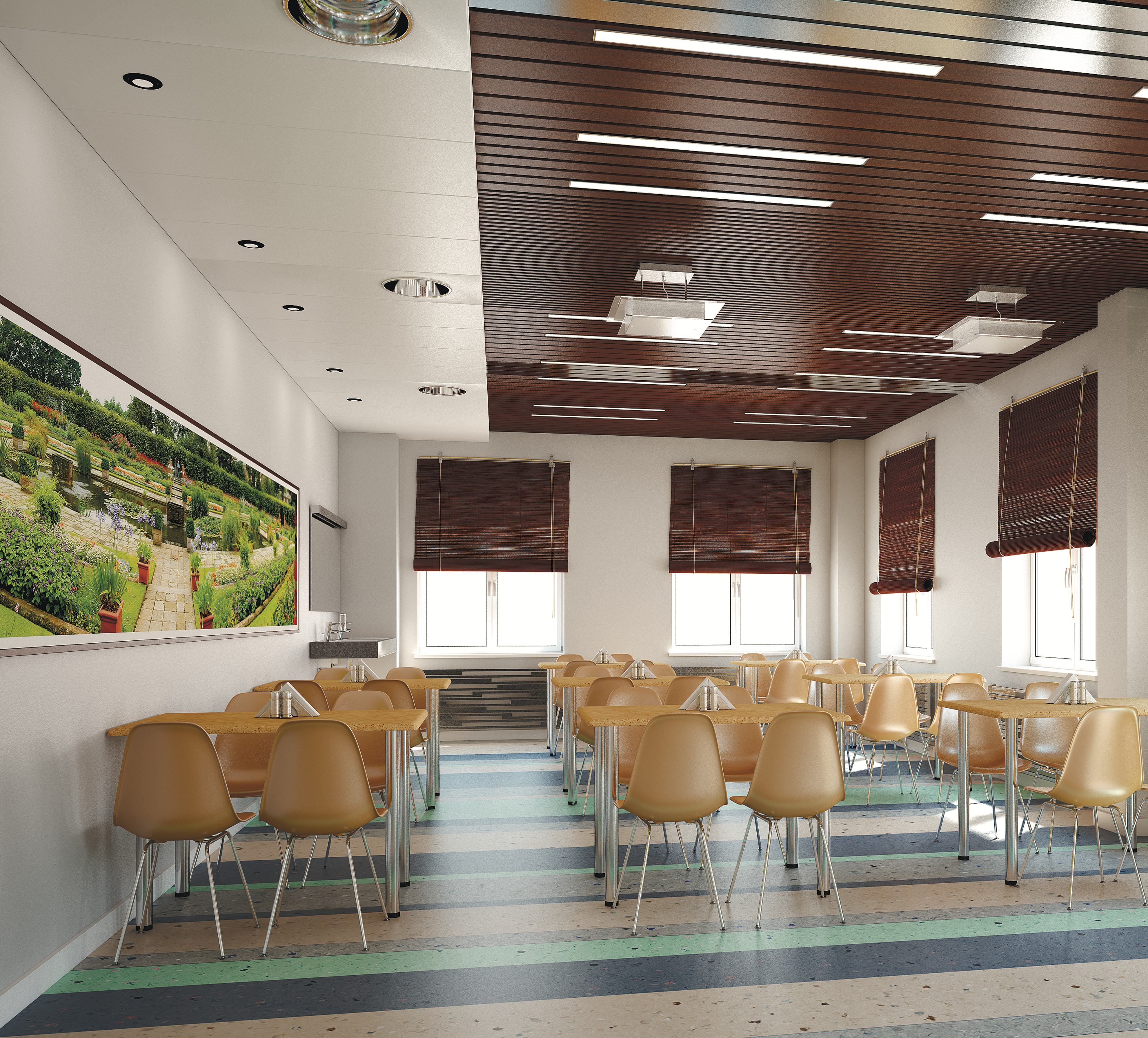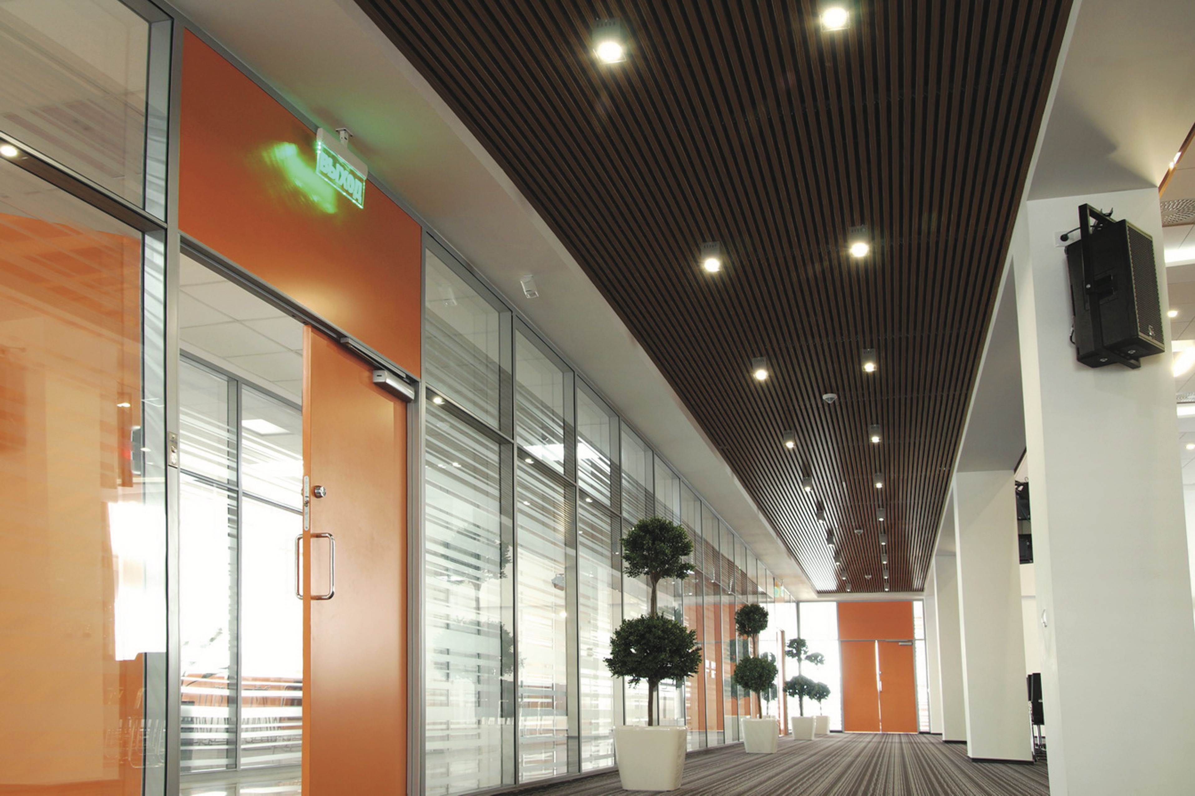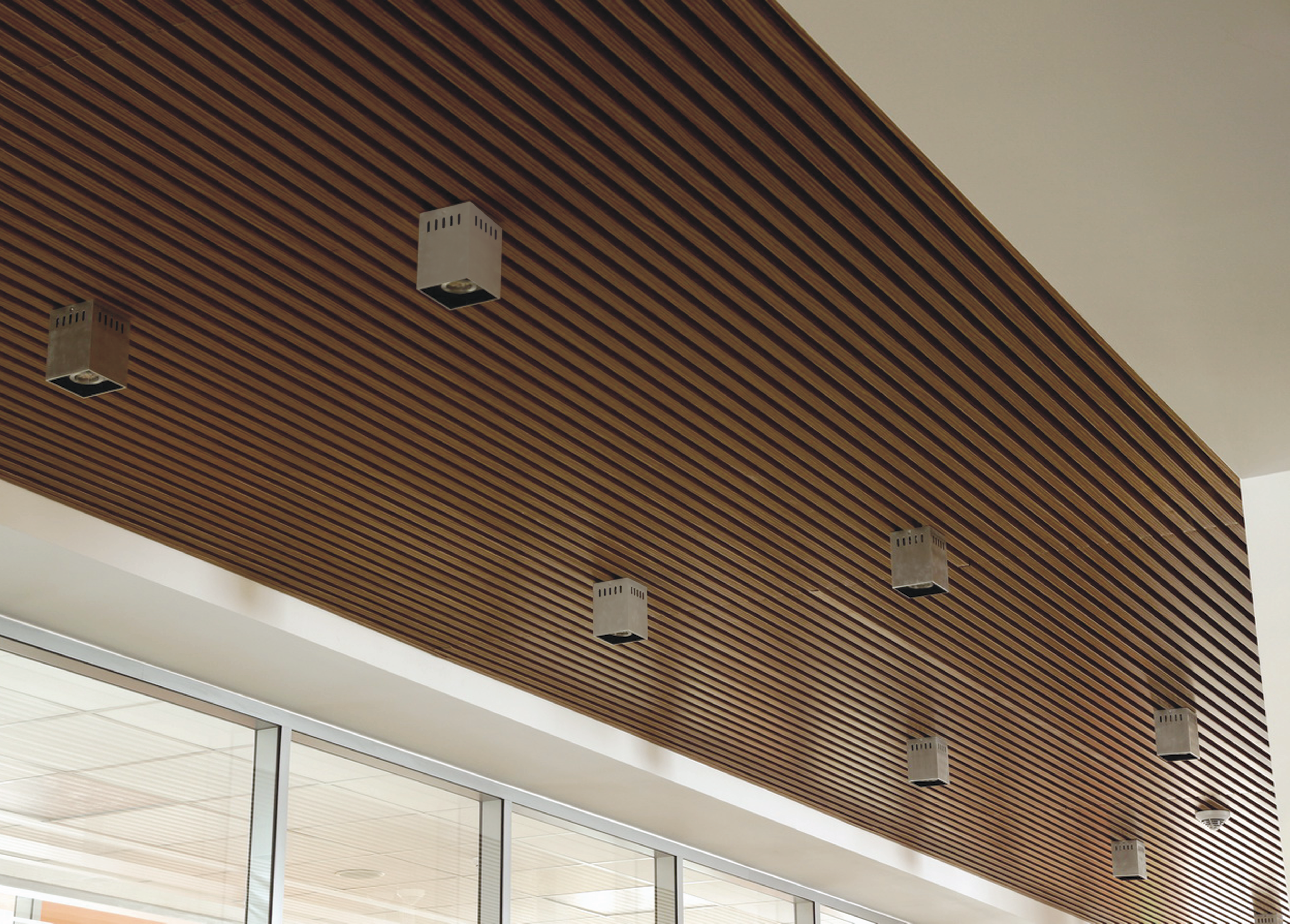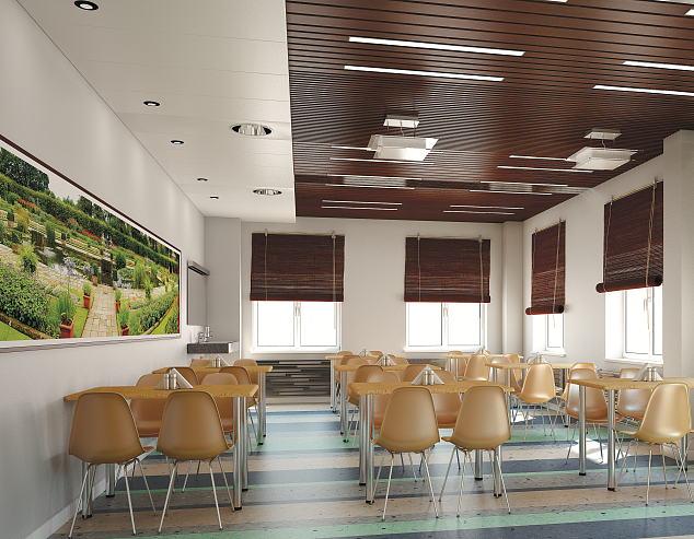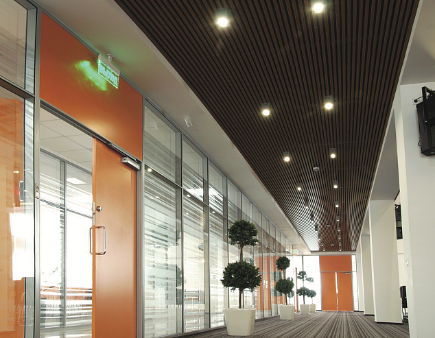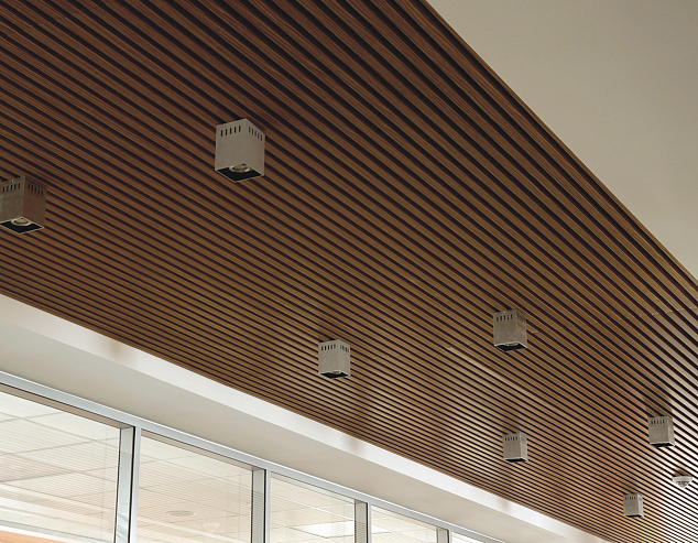 При большом шаге между рейками может быть применена декоративная вставка на гребёнку. Система допускает использование светильников, устанавливаемых между рейками, отлично справляющихся с задачами обеспечения освещения.